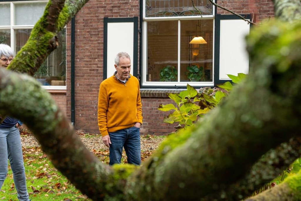 We maakten foto’s van de sierlijke schouw, de glas-in-loodramen en de oude dressoirkast van Eric’s vader. Overal zat een verhaal achter, en Eric en Carla vertelden die met veel plezier. Toen ik vroeg naar hun favoriete plekjes in huis, hoefden ze niet lang na te denken. Voor Carla is dat de hoek van de bank, schuin tegenover de open haard, met een klein stukje zicht op de tuin. Eric zit het liefst in zijn werkkamer, achter zijn bureau, omringd door Duitse woordenboeken en foto’s van zijn tijd als docent. Maar hij voegde eraan toe: “Het liefste ben ik in de tuin, lekker bezig met de planten en bloemen.”